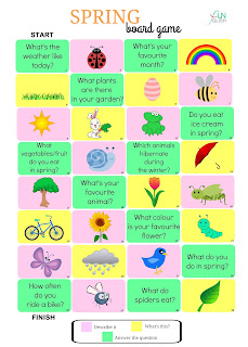Stworzyłam wiosenną grę planszową, dzięki której przypomnimy sobie wiosenne słownictwo – będziemy je nazywać i opisywać oraz będziemy odpowiadać na różne pytania.
