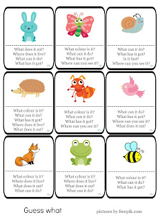 - różowe pole – opisz to co widzisz na obrazku (What is it? Is it an animal? What can it do? What does it eat? What body parts has it got? Where does it live? Do you like it? Where can we see it? Is it hot? Is it fast? ) – można wprowadzić limit zdań.