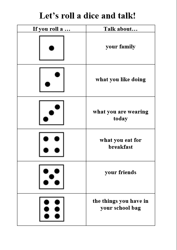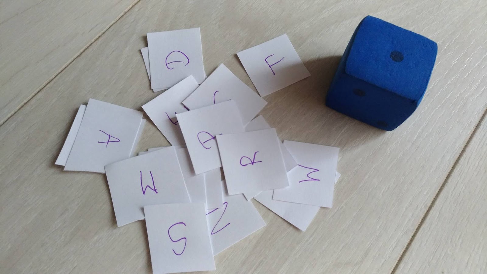 Na kartce A4 piszemy cyfry od 1-6 i nad każdą z nich układamy kilka karteczek. Biorę kostkę i wykonuję nią rzut. Liczba wyrzuconych oczek oznacza karteczkę, którą biorę (np. 2 oczka – kartka znad cyfry 2).