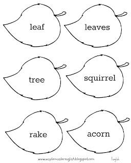 Karty z napisami drukuje na kolorowym papierze technicznym (jesienne kolory), aby nie przebijało. Obrazki lepiej wyglądały drukowane na białym papierze technicznym, choć może Wam bardziej spodobają się na kolorowym.