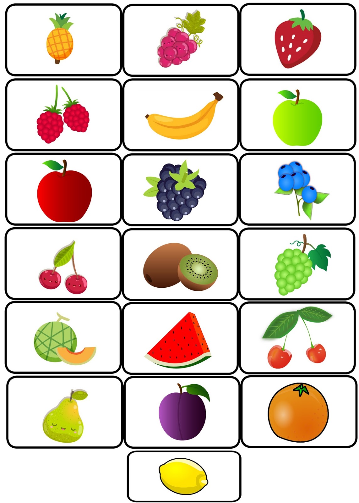 Każdy z uczniów otrzymuję jedną z plansz. Na środku kładziemy zakryte karty z owocami. Moje wydrukowałam z owocowym rewersem 🙂