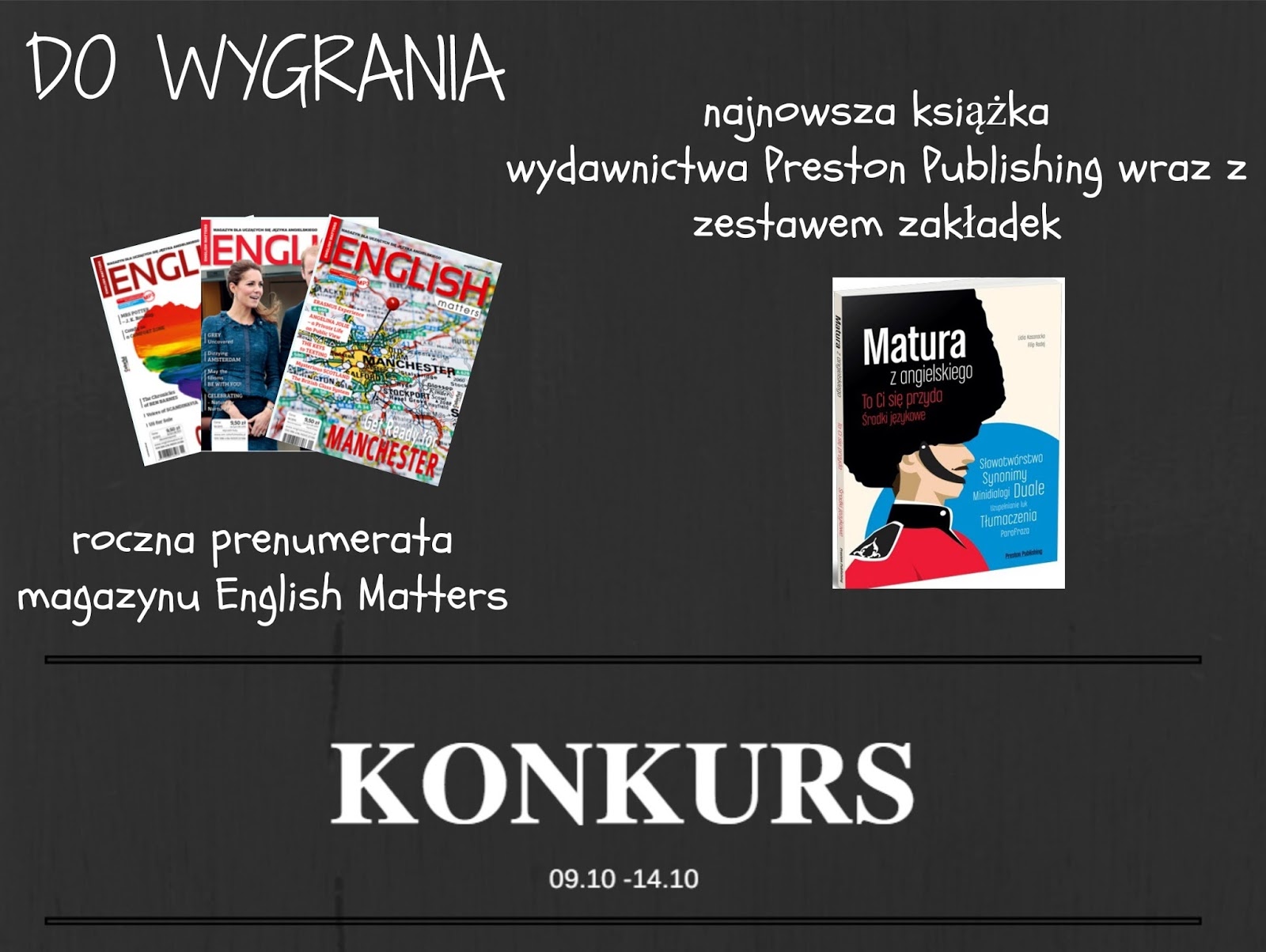 Roczna prenumerata magazynu English Matters ufundowana przez wydawnictwo Colorful Media oraz książka Matura z angielskiego. To Ci się przyda. Środki językowe wraz z zestawem zakładek od wydawnictwa Preston Publishing.