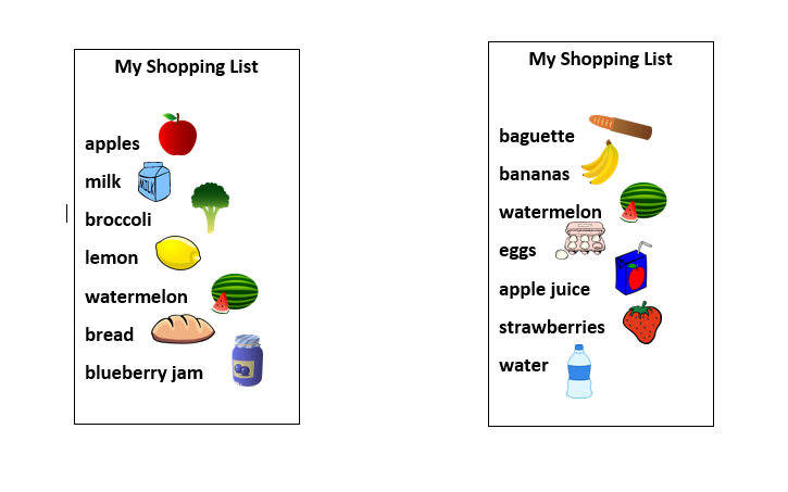 Pośrodku rozkładamy odwrócone karty. Kolejno, jeden po drugim, odkrywamy jedną kartę i ją nazywamy. Jeśli uczeń ma dany produkt na swojej Shopping List, bierze kartę i układa ją w koszyku. Jeśli nie ma, zakrywa i odkłada na miejsce.