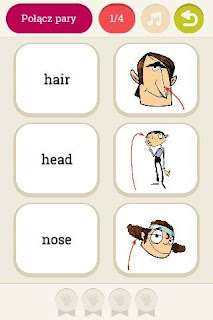 I ostatnia gra to „Połącz pary”. Nie działa to na zasadzie memory, a na łączeniu trzech obrazków z wyrazami. W tej grze dźwięk jest wyłączony, sprawdza ona znajomość formy graficznej wyrazów i tym samym przeznaczona jest dla dzieci czytających.