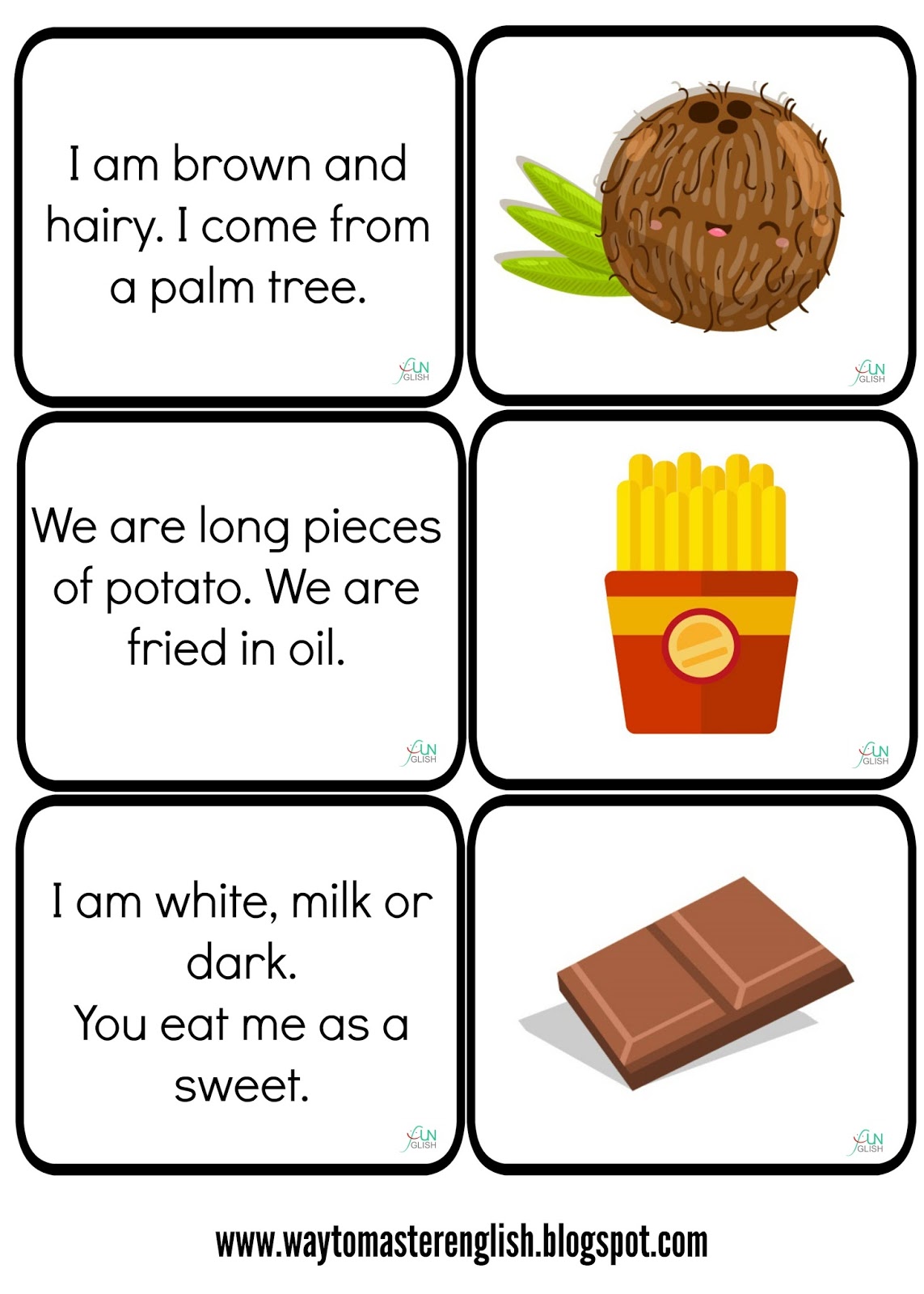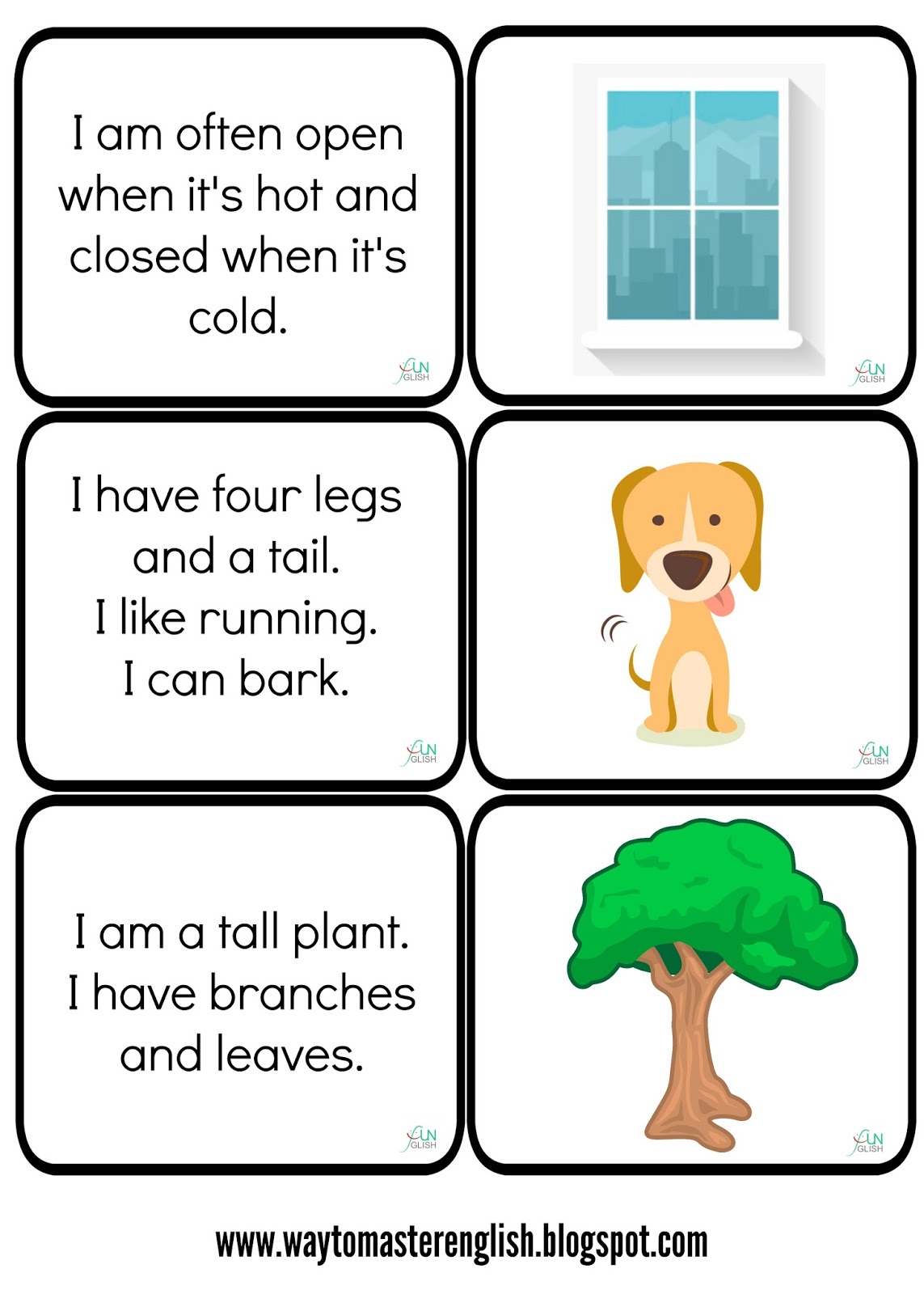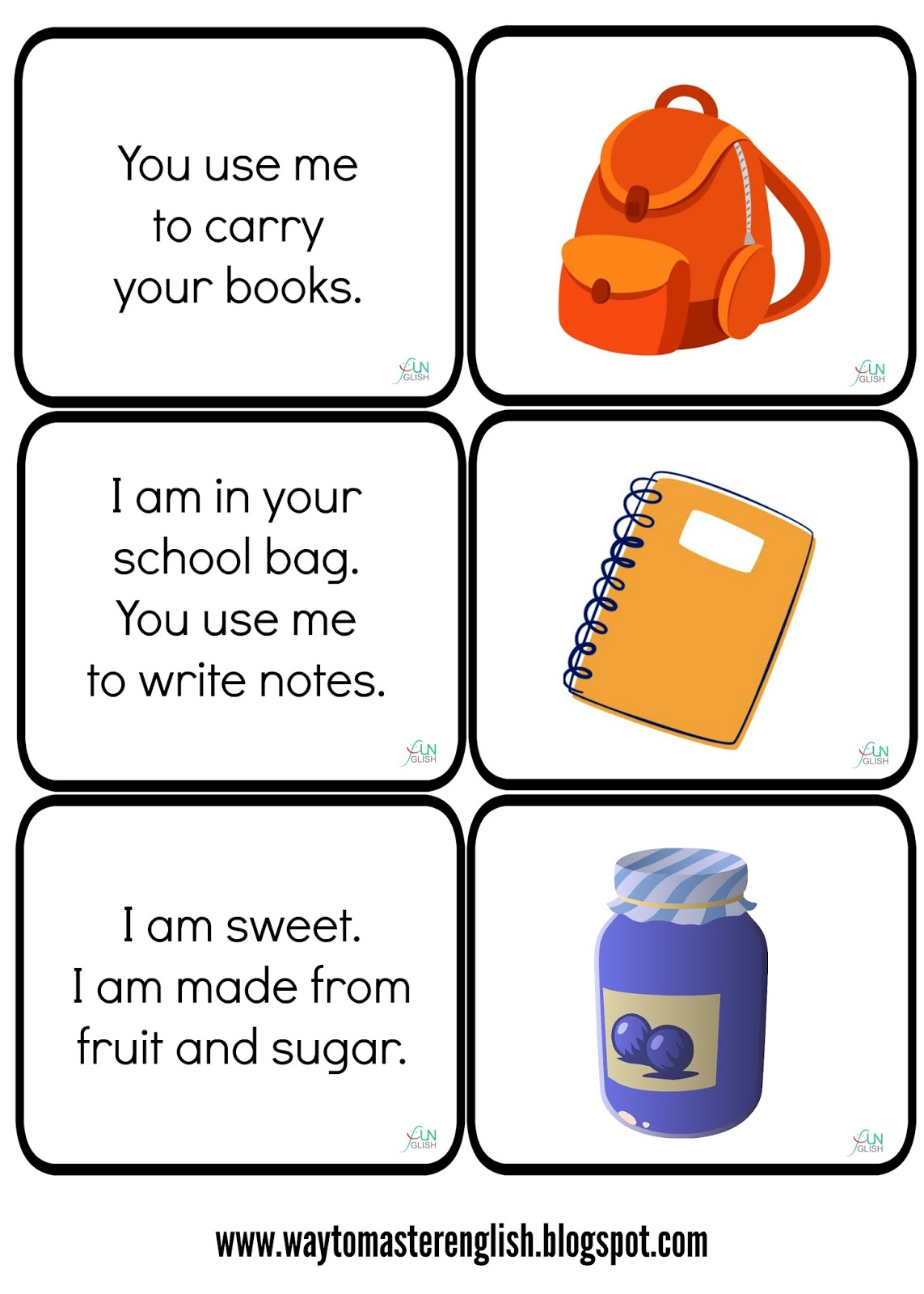 Przygotowałam nowy zestaw zagadek. Karty wycinam, uczniowie czytają karty, zgadują co to i dopasowują do obrazka.