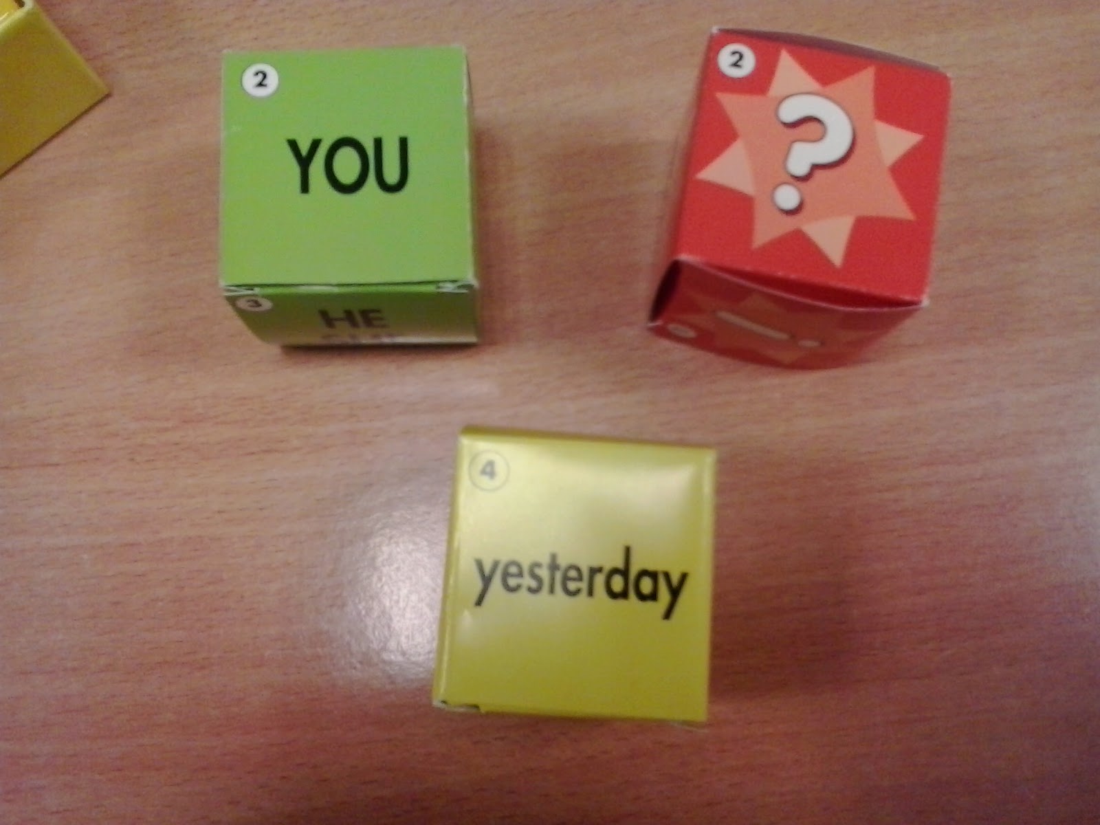 Określniki czasu (now, at the moment, usually, never, yesterday, ever/never itp.), tryby zdania (znak zapytania, kropka, minus) i zaimki osobowe można napisać samemu markerem po wydruku lub wydrukować i przykleić. Fajnie jakby kostki wydrukować na kolorowym papierze, każda inny kolor.
