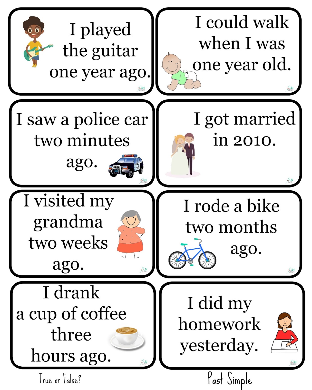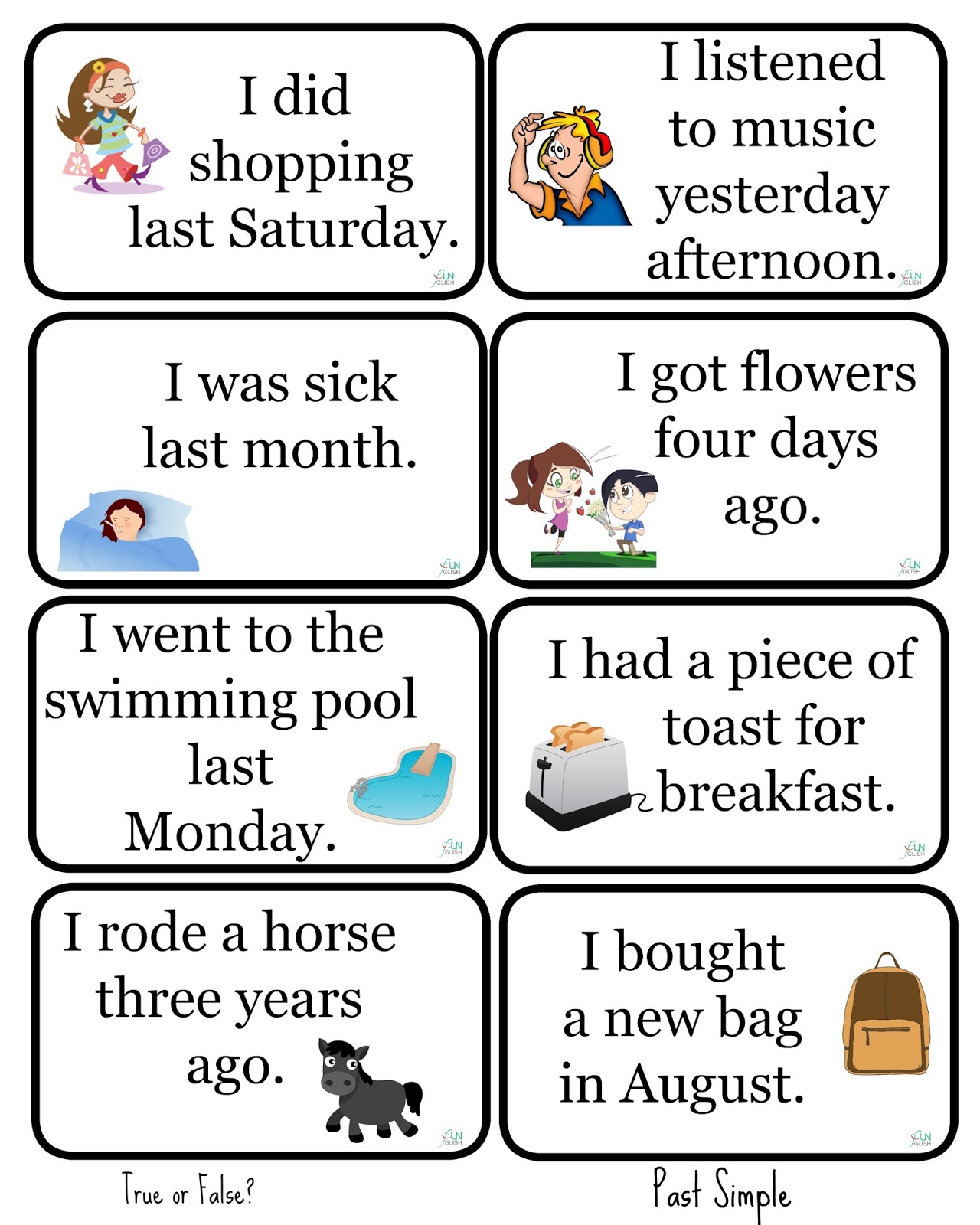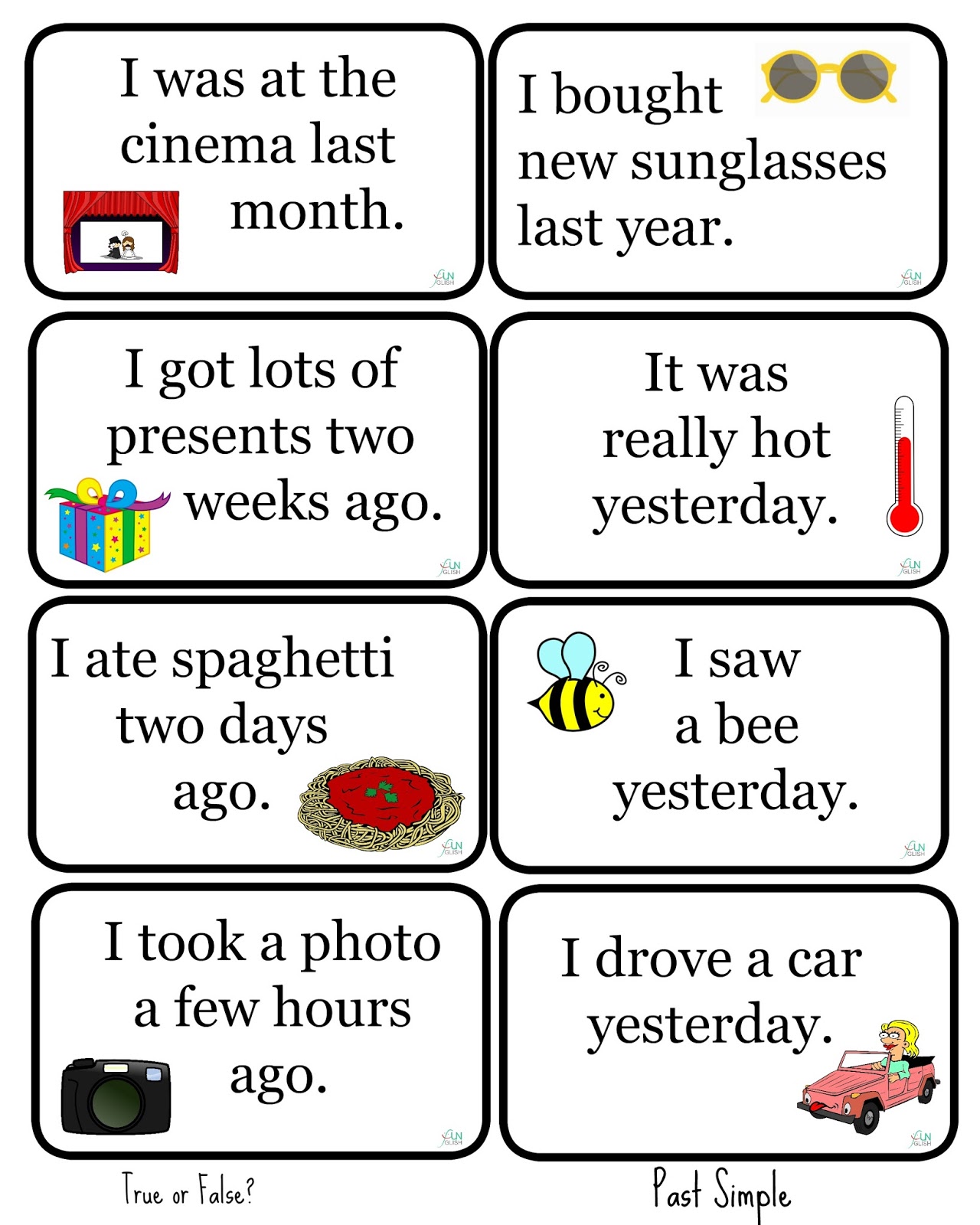 Np. Uczeń bierze kartę „I ate spaghetti two weeks ago.” i mówi „It’s true. I ate spaghetti two weeks ago.” lub „It’s false. I didn’t eat spaghetti two weeks ago. I ate spaghetti yesterday.”
