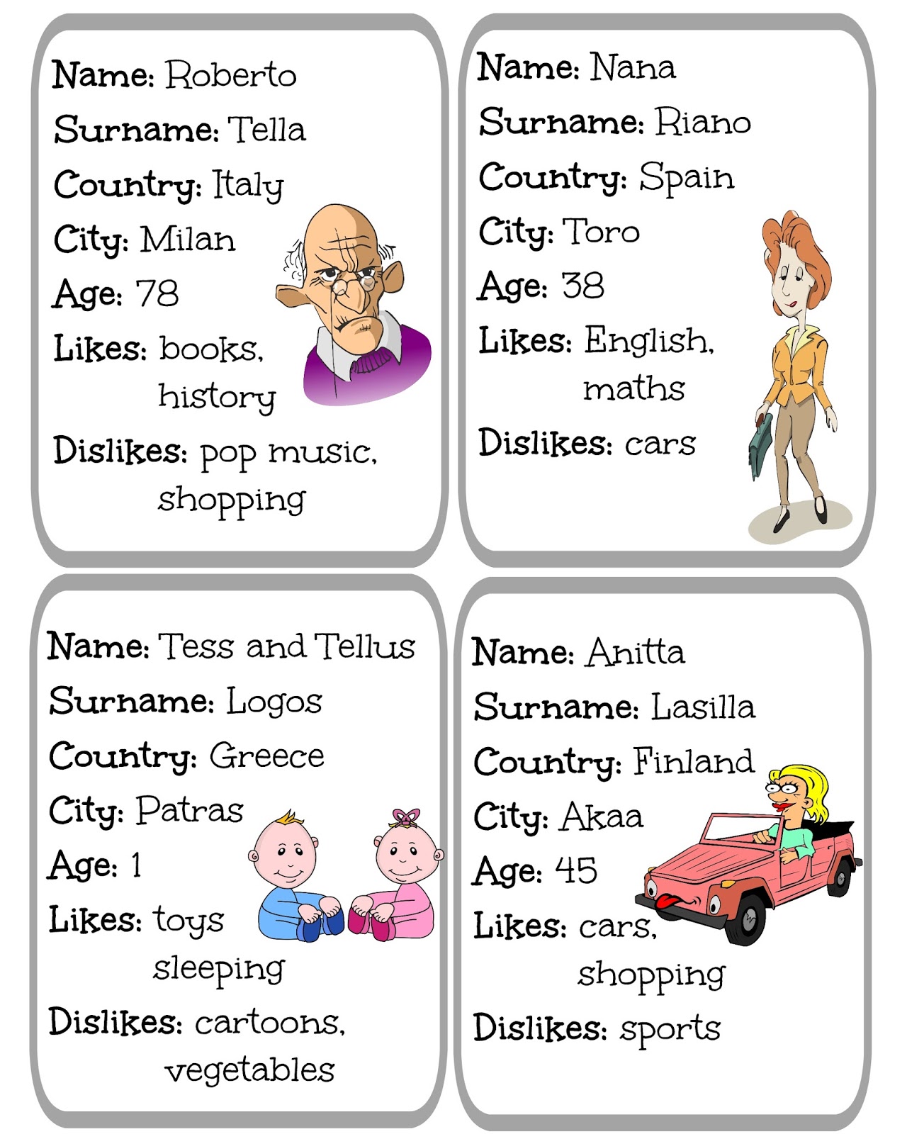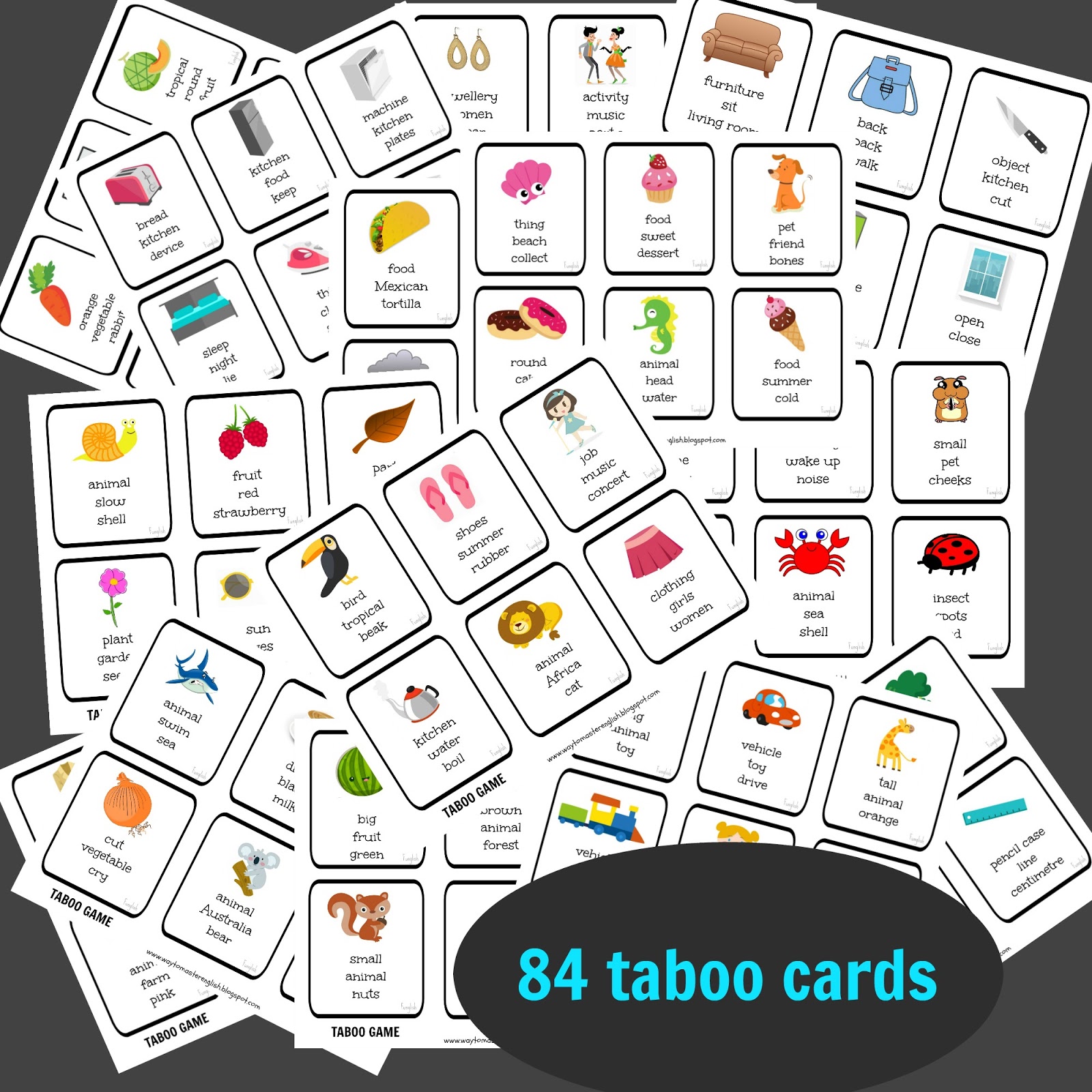 – zestaw 84 kart do gry Taboo, które, tak naprawdę, można użyć w różnych grupach wiekowych i na różnych stopniach zaawansowaniach. W oryginalnej wersji gry nie można używać „taboo words”, czyli wyrazów wymienionych na karcie. Dlaczego by jednak nie zmienić zasad i nie wykorzystać gry z młodszymi/mniej zaawansowanymi uczniami? Można ustalić, że słowa te TRZEBA użyć opisując wyraz. Karty drukujemy, wycinamy raz, a używamy wielokrotnie. Ja użyłam ich chyba już w każdej grupie 🙂