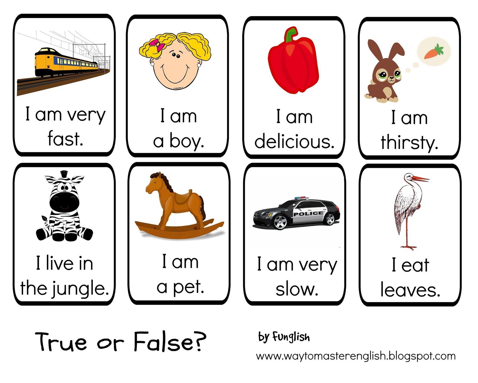 Na kartce papieru narysować węża z kropek. Każdy dostaje kostkę. Kula kostkę, ale zanim przesunie pionek musi odkryć jedną kartę (ze stosu), przeczytać i powiedzieć „True or False”. Jeśli zdanie jest fałszywe musi je poprawić. Jeśli odpowie prawidłowo może przesunąć pionek o wyrzuconą ilość oczek. Jeśli odpowiedz będzie błędna – stoi w miejscu.